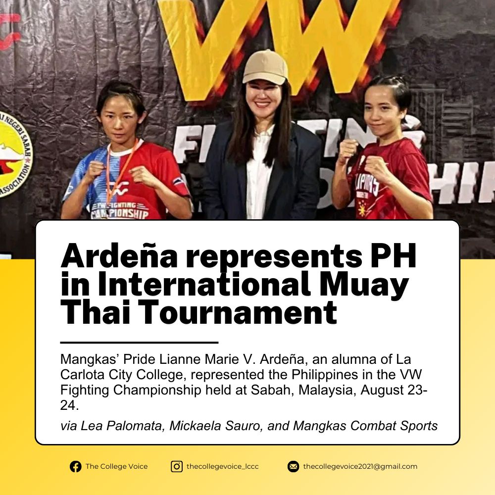 Mangkas’ Pride Lianne Marie V. Ardeña, an alumna of La Carlota City College, represented the Philippines in the VW Fighting Championship held at Sabah, Malaysia, August 23-24. She dominated the first round but fell short against opponent Sim Bee of Malaysia in the second and third rounds, resulting in a final score of 1-2 in favor of her opponent. Despite the outcome, Ardeña’s participation was a testament to her commitment and dedication, embodying the spirit of the Philippines and bringing pride and honor to the country. Ardeña is part of the Philippine Muay Thai Team, headed by Edemel Catalan and Rene Catalan Jr., along with Manuel Delos Reyes, Kier Biron, Joemar Gallaza, and Jerome Balualua. The team was trained by Head Coach Rene “The Challenger” Catalan Sr., a 2006 Doha Asian Games Wushu Gold Medalist, together with Palaweño Coach Roque Verangel Mana-ay Sr., under the management of Team Manager Robert James Lagan, a Palaweño and Chairman of Batang Atleta.