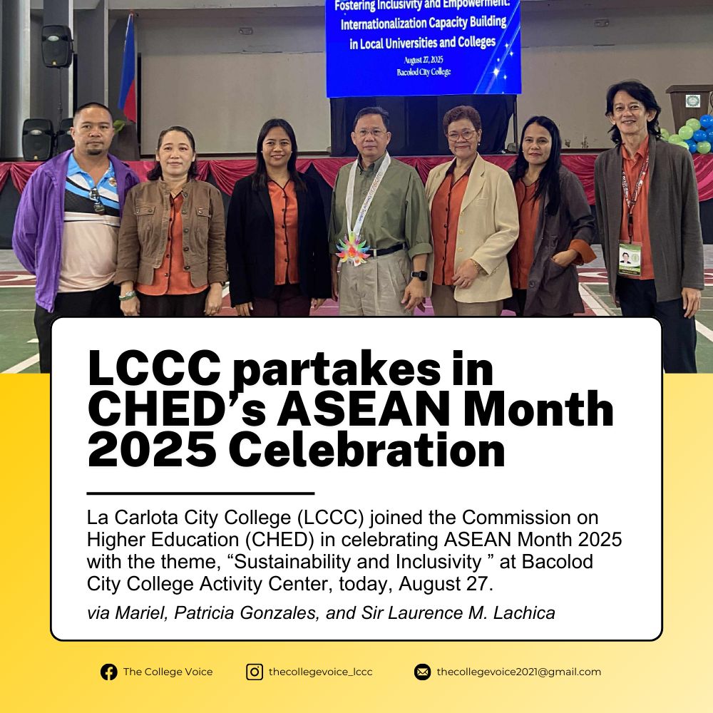 La Carlota City College (LCCC) joined the Commission on Higher Education (CHED) in celebrating ASEAN Month 2025 with the theme, “Sustainability and Inclusivity ” at Bacolod City College Activity Center, today, August 27. Pursuant to Proclamation No.282 declaring August as “ASEAN Month”, the Commission on Higher Education Office VI and CHEDROXVIII conducted a seminar on “Fostering Inclusivity and Empowerment: Internationalization Capacity Building in Local Universities and Colleges” to provide a comprehensive introduction to internationalization, equip local university and college officials with the knowledge to establish internationalization programs, and serve as a platform for institutions to connect and build networks in the field. Present at the event were Dr. Larnie Sam A. Tabuena, College President; Dr. Maylin M. Tongcua, OIC Vice President for Academic Affairs; Dr. Mary Hope Q. Ayson, Vice President for Administration and Human Resource; Rasel G. Reyes, Quality Assurance Officer; Dr. Sharon L. Apohen, Research Director; Limuel C. Solomon Jr., Community Extension Head; and Laurence M. Lachica, Students Affairs Office Head
