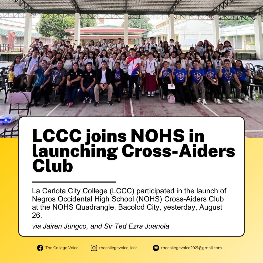 La Carlota City College (LCCC) participated in the launch of Negros Occidental High School (NOHS) Cross-Aiders Club at the NOHS Quadrangle, Bacolod City, yesterday, August 26. Romar F. Sarabia, Head Teacher III of the MAPEH Department welcomed the participants. Meanwhile, Greg Michael L. Sa-onoy, Master Teacher II of the same department, presented the club's members and advisers. Dr. Edgardo S. Apuhin Jr., the club's founder and consultant, delivered the rationale and led the induction. A message was also given by Ruby Grace Treyes, Assistant Principal II for Senior High School Academics. A key part of the launch was the presentations of Nenita Pillado, Adviser of La Carlota City College (LCCC) Cross-Aiders, and Beverly O. Sanchez, President of LCCC Cross-Aiders. They focused on the importance of a deeper understanding of basic life support and its application in saving lives, including principles of emergency care, demonstrating basic life-saving support techniques, and orienting student-volunteers about their duties and responsibilities. The event was spearheaded by Mary Grace S. Carmona, Adviser of the NOHS Cross-Aiders Club. Present during the event were representatives from LCCC, including Josefa Anna Bacong, Clinical Nurse Adviser; Ted Ezra Juanola; Aileen Balbon; and the members of the LCCC Cross-Aiders.