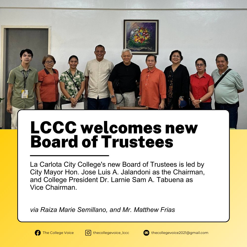 La Carlota City College's new Board of Trustees is led by City Mayor Hon. Jose Luis A. Jalandoni as the Chairman, and College President Dr. Larnie Sam A. Tabuena as Vice Chairman. The other members of the Board of Trustees include: • Dr. Ermi V. Miranda, CESO VI, OIC - Schools Division Superintendent • Hon. Stephen G. Simbit - Committee on Education Chairman • Hon. Jelarie Jean M. Liansing - Committee on Education Member • Ma. Carla C. Jardinico - Business Representative • Jose R. Parcon - Alumni Association President • Teresita B. Francisco - LCCCFEA Inc. President • Sean David J. Calumbiran - SSC President • CHED Regional Director Dr. Raul C. Alvarez, Jr., REE, CESO III, CHEDRO-NIR - Permanent Resource Person — The La Carlota City College community congratulates the members of the board and looks forward to collaborating for the growth and success of the institution. Invictus, LCCC!