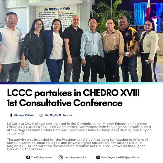 βLa Carlota City College participated in the Commission on Higher Education Regional Office XVIII (CHEDRO XVIII) 1st Consultative Conference with the Regional Director, held at the Negros Oriental Main Campus Sports and Cultural Complex in Dumaguete City on January 27. β βThe activity was intended for the President and Vice President for Academic Affairs of state universities, local colleges, and private higher education institutions (HEIs) in Region XVIII, in line with the provisions of Republic Act No. 7722, known as the Higher Education Act of 1994. β βThe conference aimed to provide a venue for discussion between the Commission and HEI leaders regarding academic and institutional concerns in the region. β βLCCC was represented by Dr. Larnie Sam A. Tabuena, College President, and Dr. Maylin M. Tongcua, OIC Vice President for Academic Affairs.