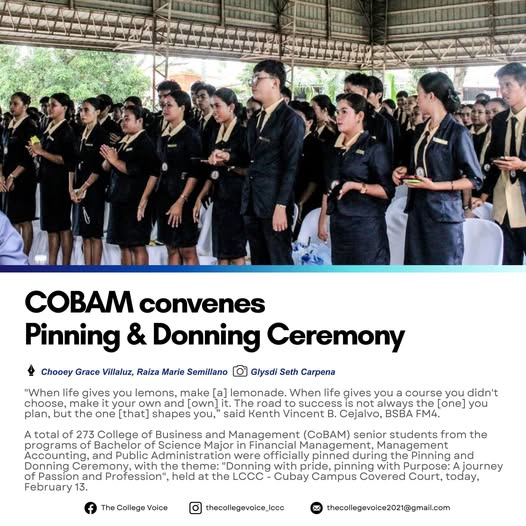 β"When life gives you lemons, make [a] lemonade. When life gives you a course you didn't choose, make it your own and [own] it. The road to success is not always the [one] you plan, but the one [that] shapes you,β said Kenth Vincent B. Cejalvo, BSBA FM4. A total of 273 College of Business and Management (CoBAM) senior students from the programs of Bachelor of Science Major in Financial Management, Management Accounting, and Public Administration were officially pinned during the Pinning and Donning Ceremony, with the theme: "Donning with pride, pinning with Purpose: A journey of Passion and Profession", held at the LCCC - Cubay Campus Covered Court, today, February 13. The student interns officially began their on-the-job training in January 2026 at different 99 partner institutions, which will prepare and shape them for real-world work practices in their future careers and professions. Present at the event were the guest speaker Ms. Rosemarie J. Sarnate, Acting PIO- Designate of PIO La Carlota; Dr. Joyce C. Decendario, Dean of the College of Business and Management; Prof. Michelle L. Borromeo, OJT Coordinator; Engr. Hazel B. Nobleza, OJT Adviser; Prof. Mary Kris S. Teodorico, OJT Adviser; and the Faculty and Staff of the College of Business and Management.