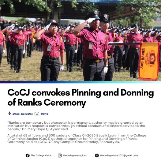 ββRanks are temporary but character is permanent, authority may be granted by an institution but respect is earned through ethical conduct and sincere service to the people,β Dr. Mary Hope Q. Ayson said. A total of 65 officers and 300 cadets of Class 01-2026 Bagsik Lawin from the College of Criminal Justice (CoCJ) gathered together for Pinning and Donning of Ranks Ceremony held at LCCC-Cubay Campus Ground today, February 24. The pinning was conducted to formally recognize students' readiness for a criminal justice career. The donning of uniform symbolizes their active commitment to their duties, especially while serving in police stations in La Carlota City, La Castellana, Pontevedra, San Enrique, and Valladolid where they are currently deployed. Present at the event were PLT Jessica Malata, Deputy Chief for Operation, La Carlota Component Police station; Dr. Mary Hope Q. Ayson, Vice President of Administration and Human Resources; Prof. Ronnie T. Basa, Program Head; Dr. Gemar I. Alarcon, OJT Coordinator; Prof. Jessa Joy T. Subaldo, OJT Coordinator; and the CoCJ faculty.