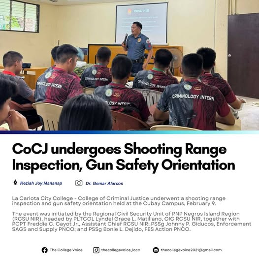 The College of Criminal Justice (CoCJ) underwent a shooting range inspection and gun safety orientation held at La Carlota City College Cubay Campus, February 9. The event was initiated by the Regional Civil Security Unit of PNP Negros Island Region (RCSU NIR), headed by PLTCOL Lyndel Grace L. Matillano, OIC RCSU NIR, together with PCPT Freddie C. Cayot Jr., Assistant Chief RCSU NIR; PSSg Johnny P. Giducos, Enforcement SAGS and Supply PNCO; and PSSg Bonie L. Dejido, FES Action PNCO. Also present during the inspection were Dr. Gemar Alarcon, Criminology Instructor, and Mr. Ian Dexter Del Rosario, Supply Officer.