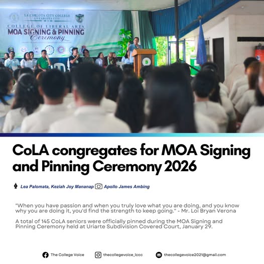 β"When you have passion and when you truly love what you are doing, and you know why you are doing it, you'd find the strength to keep going." - Mr. Loi Bryan Verona β βA total of 145 CoLA seniors were officially pinned during the MOA Signing and Pinning Ceremony held at Uriarte Subdivision Covered Court, January 29. β βThe senior students will be deployed to various Host Training Establishments (HTEs), including the Local Government Units of La Carlota, La Castellana, San Enrique, Pontevedra, and institutions such as Pax Catholic Academy, Colegio de La Castellana, and Pontevedra National High School. β βHon. AΓ±ejo Nicor, Municipal Mayor of La Castellana, emphasized the importance of education, highlighting that it is the best investmentβthe key that will help us change our situation in life. β βThe ceremony marked the transition from education to practice and formalized partnerships, outlining mutual responsibilities during the deployment. β βPresent at the event were Dr. Larnie Sam A. Tabuena, College President; Prof. Laurence M. Lachica, Head of the Students Affairs Office; Dr. Marilou B. Yanson, Dean of CoLA; Prof. Nicolas N. Galabasa, Program Head of CoLA; Prof. Angelo A. Belarmino, CoLA Internship Coordinator; Hon. AΓ±ejo Nicor, Municipal Mayor of La Castellana; Mr. Loi Bryan Verona, LGU Pontevedra; and Pastor Stephen Flora, College Library Aid and Instructor, along with the CoLA faculty and staff.
