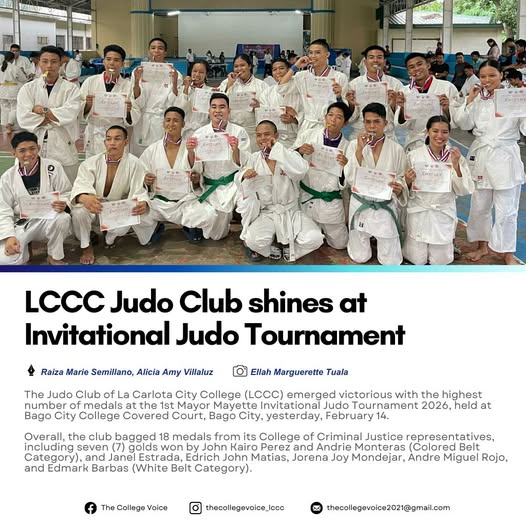 The Judo Club of La Carlota City College (LCCC) emerged victorious with the highest number of medals at the 1st Mayor Mayette Invitational Judo Tournament 2026, held at Bago City College Covered Court, Bago City, yesterday, February 14. Overall, the club bagged 18 medals from its College of Criminal Justice representatives, including seven (7) golds won by John Kairo Perez and Andrie Monteras (Colored Belt Category), and Janel Estrada, Edrich John Matias, Jorena Joy Mondejar, Andre Miguel Rojo, and Edmark Barbas (White Belt Category). Five (5) silver medals were secured by Ryne Palacios and Ahron David Liquez (Colored Belt Category), while Fritz Andrew Benitez, Jayvie Carnecer, and Jose Rizaldy Tobias added to the tally in the White Belt Category. Six (6) bronze medals in the White Belt Category came from Justine Soner, Kent Adrian Angelico, Loreen Pacheco, Hermil John Guillermo, Cyrin Glaiza Tenerife, and Sherluck Kate Sapin. Also participated in the event were Crystal Mae Cantallopez, Kert Marquez, Justin Genton, Rio Jesser Piorque, Leemar Camandona, Jhon Madrona, Reymary EstaΓ±ol, John Carlo Zamora, Chee Anne Mingao, Ramilyn Rodrigo, Jayden James Sotto from the College of Criminal Justice, and Mickey John Berto and Dhonn Quibete from the College of Business and Management. Together with the representatives was one of their Judo coaches, Mrs. Anchenet S. Malicse. The club is under the supervision of Mr. Stephen V. Flora, Judo Club Adviser, and Sir Peter John B. Ambid, Judo Coach. This achievement stands as a testament to the determination and perseverance of the Judokas, bringing glory and pride to both the club and the institution. Invictus LCCCians!