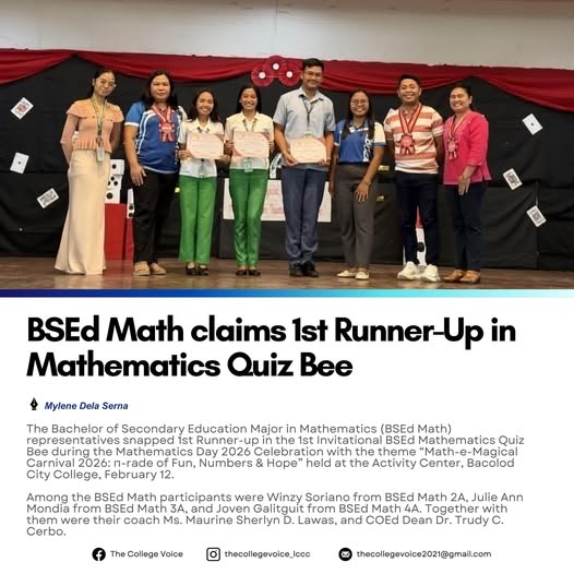 TThe Bachelor of Secondary Education Major in Mathematics (BSEd Math) representatives snapped 1st Runner-up in the 1st Invitational BSEd Mathematics Quiz Bee during the Mathematics Day 2026 Celebration with the theme βMath-e-Magical Carnival 2026: Ο-rade of Fun, Numbers & Hopeβ held at the Activity Center, Bacolod City College, February 12. Among the BSEd Math participants were Winzy Soriano from BSEd Math 2A, Julie Ann Mondia from BSEd Math 3A, and Joven Galitguit from BSEd Math 4A. Together with them were their coach Ms. Maurine Sherlyn D. Lawas, and COEd Dean Dr. Trudy C. Cerbo. Congratulations, BSEd Math! Invictus LCCC!
