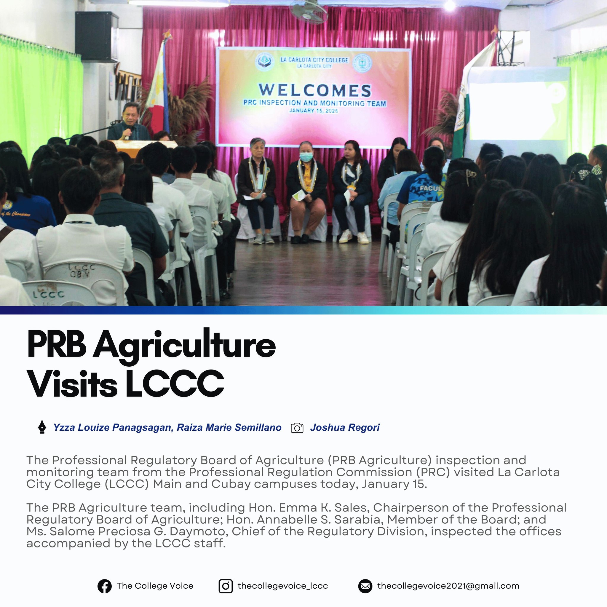 The Professional Regulatory Board of Agriculture (PRB Agriculture) inspection and monitoring team from the Professional Regulation Commission (PRC) visited La Carlota City College (LCCC) Main and Cubay campuses today, January 15. The PRB Agriculture team, including Hon. Emma K. Sales, Chairperson of the Professional Regulatory Board of Agriculture; Hon. Annabelle S. Sarabia, Member of the Board; and Ms. Salome Preciosa G. Daymoto, Chief of the Regulatory Division, inspected the offices accompanied by the LCCC staff. The team focused on the College of Agriculture (CoAg) to check documents, resources, facilities, and the eligibility of CoAg faculty members to teach the six core subjects in the Agriculture Licensure Examination (ALE), namely: Soil Science, Animal Science, Agricultural Extension and Communication, Crop Science, Agricultural Economics and Marketing, and Crop Protection. This process ensures that students receive an education that sufficiently prepares them for future board examinations and professional practice. The team was first welcomed through an opening program held at the Graduate School Library β Main Campus. The program was attended by Dr. Larnie Sam Tabuena, College President; Dr. Maylin Tongcua, OIC Vice President for Academic Affairs; Dr. Mary Hope Ayson, Vice President for Administration and Human Resource; Prof. Leah Velasco, Vice President for Finance; Dr. Ma. Cecilia Mercado, Dean of the College of Agriculture; faculty members; CoAg overall student officers; and selected students from the CoEd.