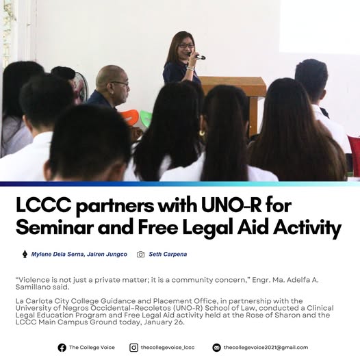 βViolence is not just a private matter; it is a community concern,β Engr. Ma. Adelfa A. Samillano said. β La Carlota City College Guidance and Placement Office, in partnership with the University of Negros OccidentalβRecoletos (UNO-R) School of Law, conducted a Clinical Legal Education Program and Free Legal Aid activity held at the Rose of Sharon and the LCCC Main Campus Ground today, January 26. β Engr. Ma. Adelfa A. Samillano shared valuable insights on the Anti-Violence Against Women and Children law. Ms. Esther Faith Gonzaga discussed the Bawal Bastos Law or RA 11313, highlighting, βCarefulness costs you nothing. Carelessness may cost you your life.β Sir Alexis Z. Ligayo discussed the enforcement of environmental laws, addressing their importance, the persons liable for violations, and the corresponding penalties. β The event was conducted to educate participants on crucial laws, provide accessible legal assistance, and remind them of their shared responsibility in ensuring that everyone feels safe and valued. It reflected the importance of awareness and preparedness in every situation, reinforcing the Collegeβs commitment to community empowerment and social justice.
