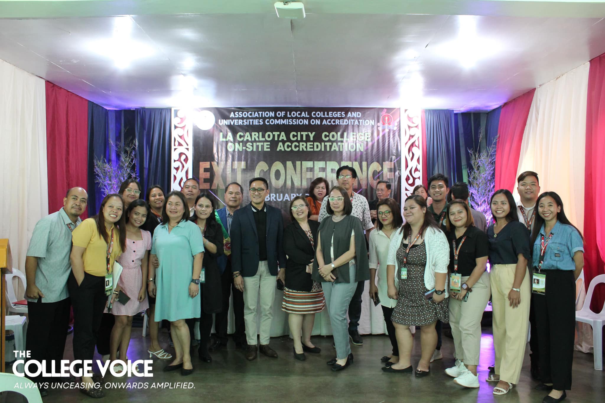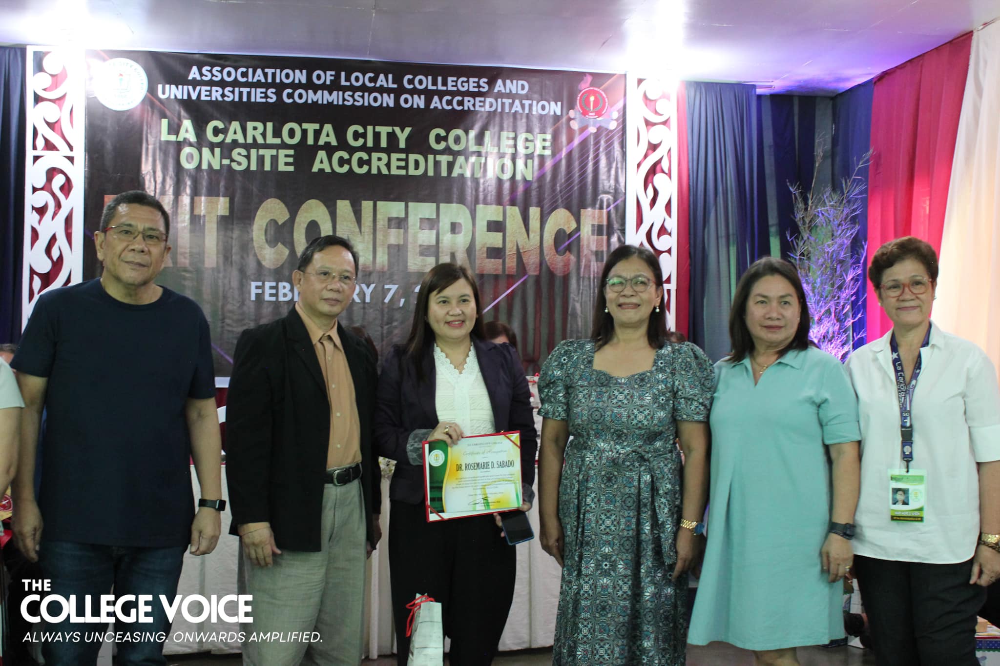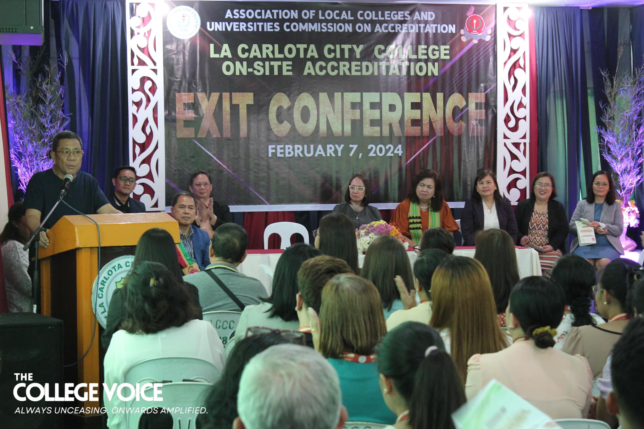 The end of the three-day on-site accreditation of La Carlota City College (LCCC) by the Association of Local Colleges and Universities - Commission on Accreditation (ALCU-COA) was met with an exit conference on February 7, 2024 at the school's Graduate School Library. Together with Mayor Rex R. Jalando-on and the ALCU-COA team of accreditors, the LCCC faculty and staff kickstarted the program with welcome remarks from Dr. Larnie Sam A. Tabuena, the College President. Hon. Jalando-on followed suit and gave his remarks as well. As the Chairman of the Board of Trustees, he remarked that this is the first time he has ever seen all the employees gathered in one room and took the opportunity to thank them for their hard work. After the College President and the honorable Mayor has given their oration, the sharing of overall impressions of the program and area accreditors have begun. The ALCU-COA accreditors have shared the commendable and exemplary strengths of the College as well as the areas where the institution needs improvement. They hope that their recommendations and suggestions will be well-received for the betterment of LCCC. To conclude the sharing of overall impressions, Dr. Imelda P. Soriano—the supervising accreditor—has spoken the accreditation team’s words of gratitude toward the College. She notes that in all her ten years of accrediting schools and colleges, this is the first time that a mayor has attended the exit conference. With this, she felt the sincerity and eagerness of Hon. Jalando-on to really be involved in the amelioration of La Carlota City College. Subsequent to hearing the remarks and thanks of the accreditors, Prof. Rasel G. Reyes, the Chairman of the Quality Assurance Center, together with Prof. Leah D. Velasco, Vice President of Finance, Mayor Rex Jalando-on, and Dr. Larnie Sam A. Tabuena, presented the plaque and token of appreciation. These were received by Prof. Roilingel Calilung (Library Area Accreditor), Prof. Earl Joseph M. Borgona (Program Accreditor, BSBA - Financial Management), Dr. Dolores Doronila-Borras (Program Accreditor, BSED Filipino), Dr. Rosemarie D. Sabado (Program Accreditor, BEED General Education), Dr. Ronald Gonzales (Program Accreditor, BSED ENGLISH and BA English), Dr. Valentino Baac (Program Accreditor, BS Public Administration), Dr. Rebecca C. Tolentino (Program Accreditor, BSED Math), Atty. Gloria V. Bañas (Program Accreditor, BS Management Accounting), and Dr. Imelda DP. Soriano, Supervising Accreditor and (Program Accreditor, Bachelor of Early Childhood Education). The exit conference ended on a happy note thanks to the joyful closing remarks made by the Chairperson of the External Affairs, Dr. Maylin M. Tongcua. Words | Andrea Buala Photos | David #TheCollegeVoice #AlwaysUnceasingOnwardsAmplified #LCCC_OnSiteAccreditation